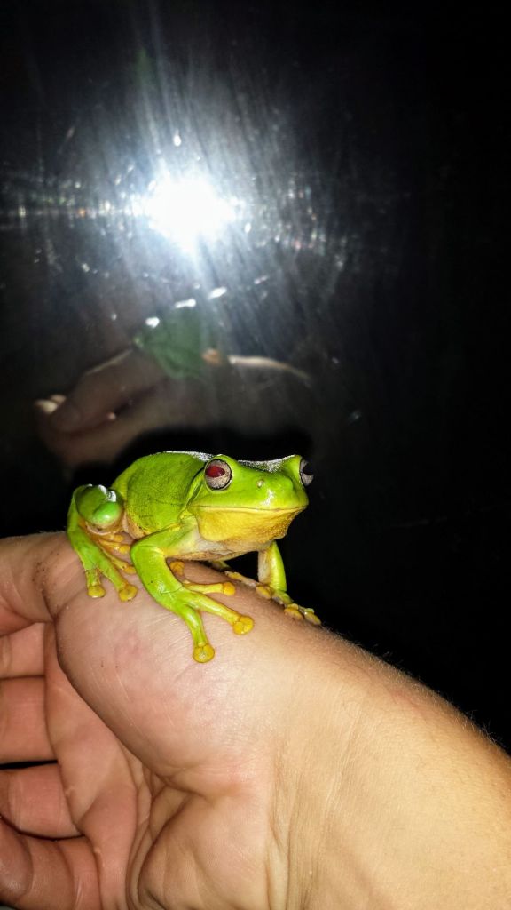 Sharing the bathroom with the green tree frogs became part of the daily routine. Every evening, as I brushed my teeth, they would boldly pop their heads out of a hole in the wall, completely unfazed by my presence. Their fearless charm added a touch of humor and wonder to camp life.