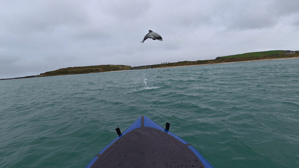 By 12:30 in the afternoon, I was heading out into the bay. The sky was grey and moody, but the sea was calm. I had packed two small rocks with me and brought them out in the raft. Once I was drifting offshore, I tapped the rocks together underwater and slapped the paddle gently on the surface. Within minutes, I noticed movement in the water. Hector’s dolphins. They were coming straight towards me, drawn by curiosity, they closed the distance, and soon I was surrounded.