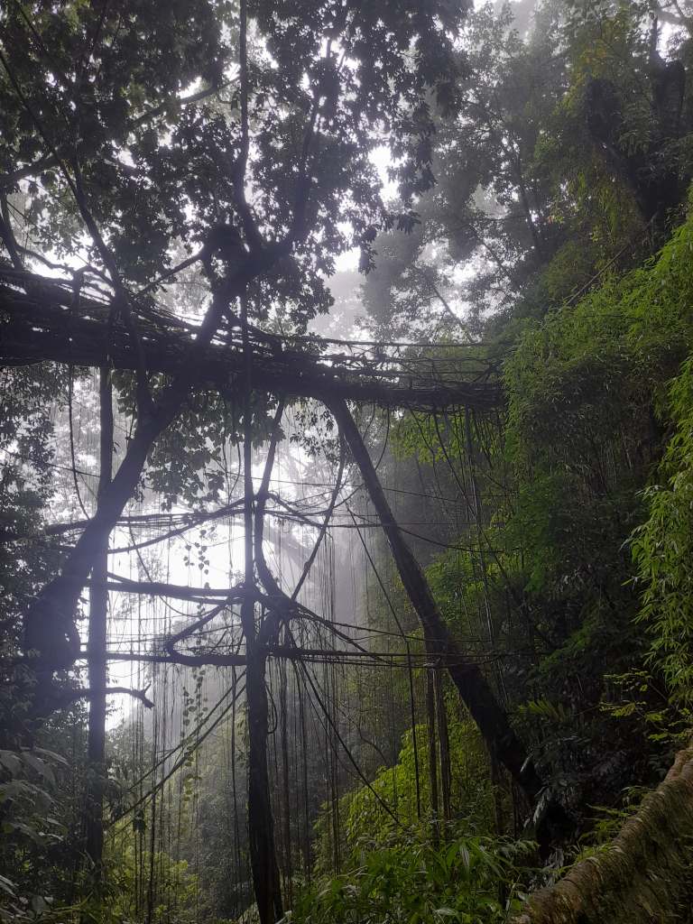 To adapt to this extreme environment, the indigenous Khasi and War communities developed an ingenious solution: bridges made from the living aerial roots of rubber fig trees (Ficus elastica).